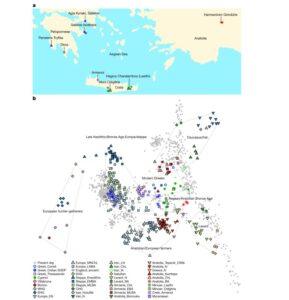 Η μελέτη DNA από 19 αρχαίους σκελετούς αποκάλυψε ότι οι Μινωίτες της Κρήτης και οι Μυκηναίοι της ηπειρωτικής Ελλάδας ήταν γενετικά σχεδόν ταυτόσημοι.11 Τουλάχιστον τα τρία τέταρτα της καταγωγής τους προέρχονται από τους πρώτους Νεολιθικούς αγρότες της Αιγαιακής Κοίτης.11 Η θεωρία ότι οι Μυκηναίοι ήταν «ξένοι» κατακτητές καταρρέει. Η μικρή συνιστώσα από την Ανατολική Ευρώπη που εντοπίστηκε στους Μυκηναίους δεν ήταν αποτέλεσμα «εισβολής», αλλά σταδιακής επιμιξίας που δεν αλλοίωσε τον βασικό αιγαιακό κορμό. 11
