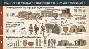 Το μεγαλύτερο σφάλμα που κληροδοτήθηκε στη δημόσια αφήγηση είναι η ιδέα ότι η ιστορία προχωρά μόνο με καθαρές ρήξεις, παρθενογενέσεις και ολικούς αφανισμούς. Τα δεδομένα δείχνουν το αντίθετο. Οι Μυκηναίοι δεν «έσβησαν» τους Μινωίτες από τον χάρτη σαν να επρόκειτο για δύο ασύνδετους κόσμους. Πάτησαν πάνω σε έναν ήδη οργανωμένο αιγαιακό ορίζοντα, αξιοποίησαν υπάρχουσες δομές, προσάρμοσαν το μινωικό διοικητικό υπόβαθρο στη δική τους γλώσσα, ενσωμάτωσαν σύμβολα, τελετουργίες και μορφές κύρους, και μετέτρεψαν την κληρονομιά του μινωικού κόσμου σε θεμέλιο της δικής τους ηγεμονίας.