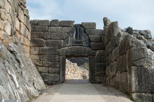 Η Πύλη των Λεόντων (περ. 1250 π.Χ.) — η μόνη διατηρημένη μνημειακή γλυπτική σύνθεση της Εποχής του Χαλκού στην Ευρώπη — είναι κάτι παραπάνω από μια θύρα. Είναι ένα πολιτικό δήλωμα. Οι δύο λέαινες που πλαισιώνουν έναν κίονα (σύμβολο ανακτορικής εξουσίας) δηλώνουν: εδώ βρίσκεται η έδρα μιας αυτοσυνείδητης, αυτοαπεικονιζόμενης δύναμης.